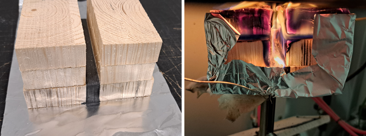 Cone calorimeter tests: Flexible joint between two timber members was tested with constant incident heat flux of 50 kW/m2. Three conditions have been considered; with joint in line with structural surface, and with joint 20 mm and 40 mm withdrawn from the surface to simulate reduction of the material inside the joint. In the first case the joint material ignited before the surrounding wood, otherwise it ignites when the wood burning front reached the joint surface.