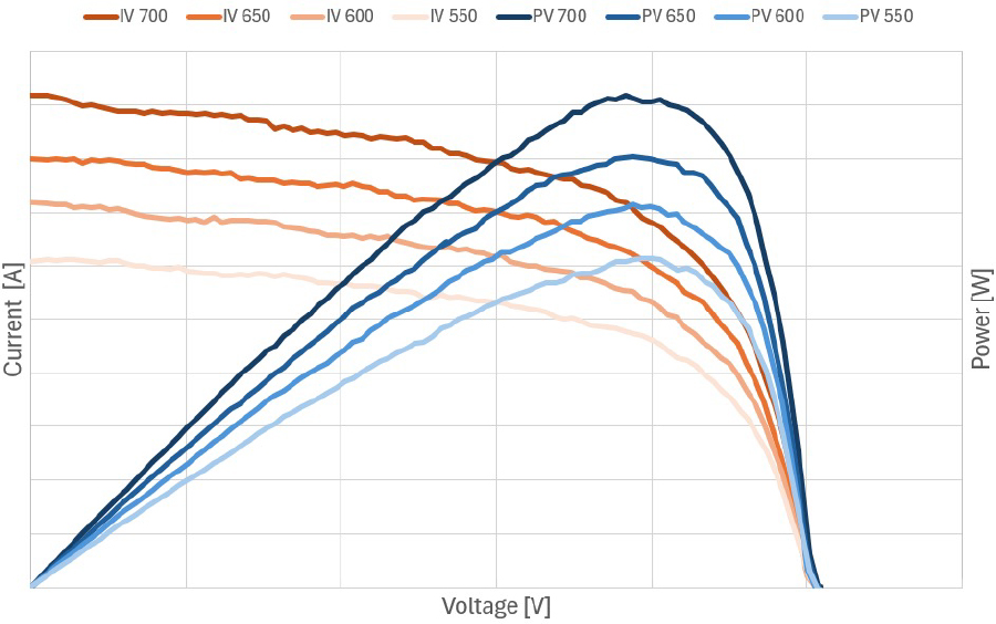 IV curve at maximum power output and daily weather data plots for a large HeliaFilm panel installed vertically, simulating a real-world, south-facing building facade installation.