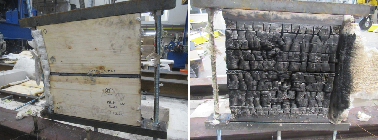 Cone calorimeter tests: Flexible joint between two timber members was tested with constant incident heat flux of 50 kW/m2. Three conditions have been considered; with joint in line with structural surface, and with joint 20 mm and 40 mm withdrawn from the surface to simulate reduction of the material inside the joint. In the first case the joint material ignited before the surrounding wood, otherwise it ignites when the wood burning front reached the joint surface.