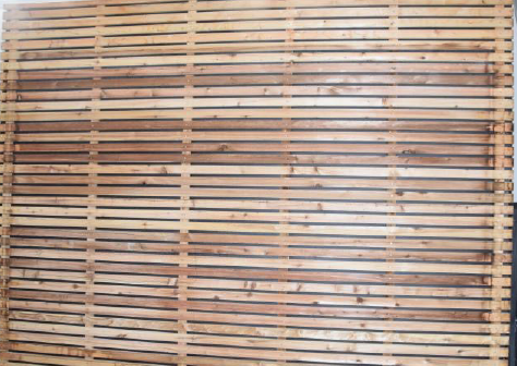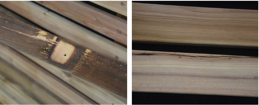 Impact resistance: The damage caused by steel ball impacts depends mainly on impact energy, but also on wood quality, and density. Artificial aging has little effect. Edges are most vulnerable, possibly disadvantaging wooden slats with dilatation compared to tongue and groove boards.