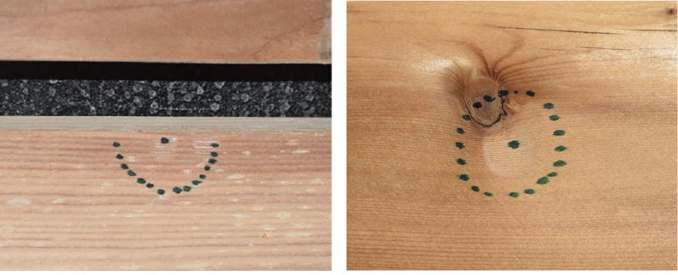Visual inspection after artificial ageing: The wood showed minor colour changes, slight chipping, and raised knots on less than 0.01% of the surface. Traces of water retention were noted at cladding joints, with more moisture observed in the configuration without gaps. No serious wood deterioration was found.
