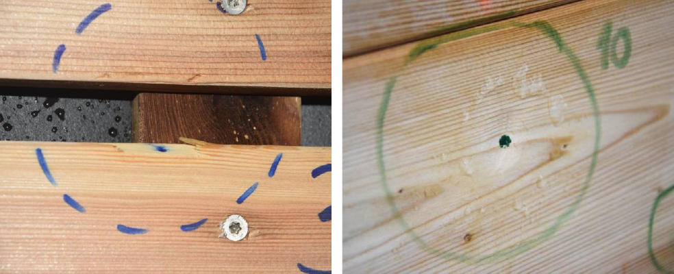 Hail resistance: The damage caused by ice ball impacts of varying sizes and masses depends more on the wood’s quality and density at the impact point than on the ice ball’s size or mass. Artificial aging appears to have little effect on the degree of damage. The edges of the wooden claddings are the most vulnerable areas, potentially putting wooden slats with dilatation at a disadvantage compared to tongue and groove boards in terms of hail resistance.